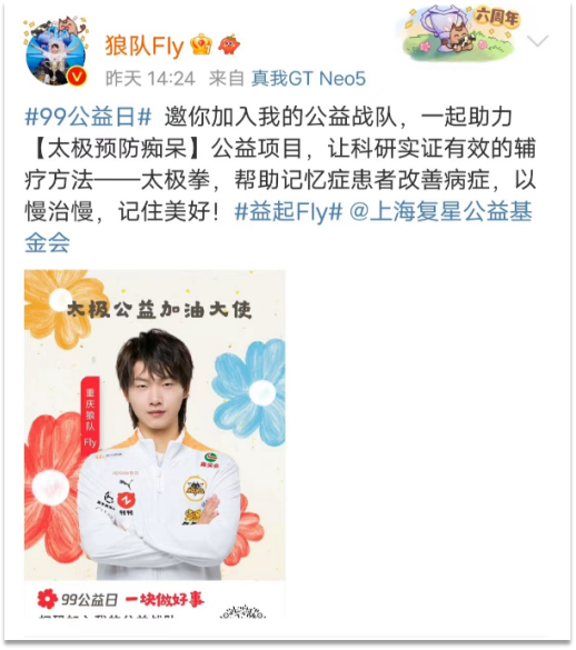 林更新、张天爱、重庆狼队FLY、重庆狼队·妖刀、成都Wolves.487、深圳Wolves 77H,为青沃计划(青年村医培养计划)、关爱豆蔻计划、太极预防痴呆3大公益项目助力Call!在“乡村医生守护者”、“豆蔻关爱大使”、“太极公益加油大使”们的公益倡导下,99期间项目相关的图文、视频在微博、公众号、腾讯公益等平台,传播量超246万次。