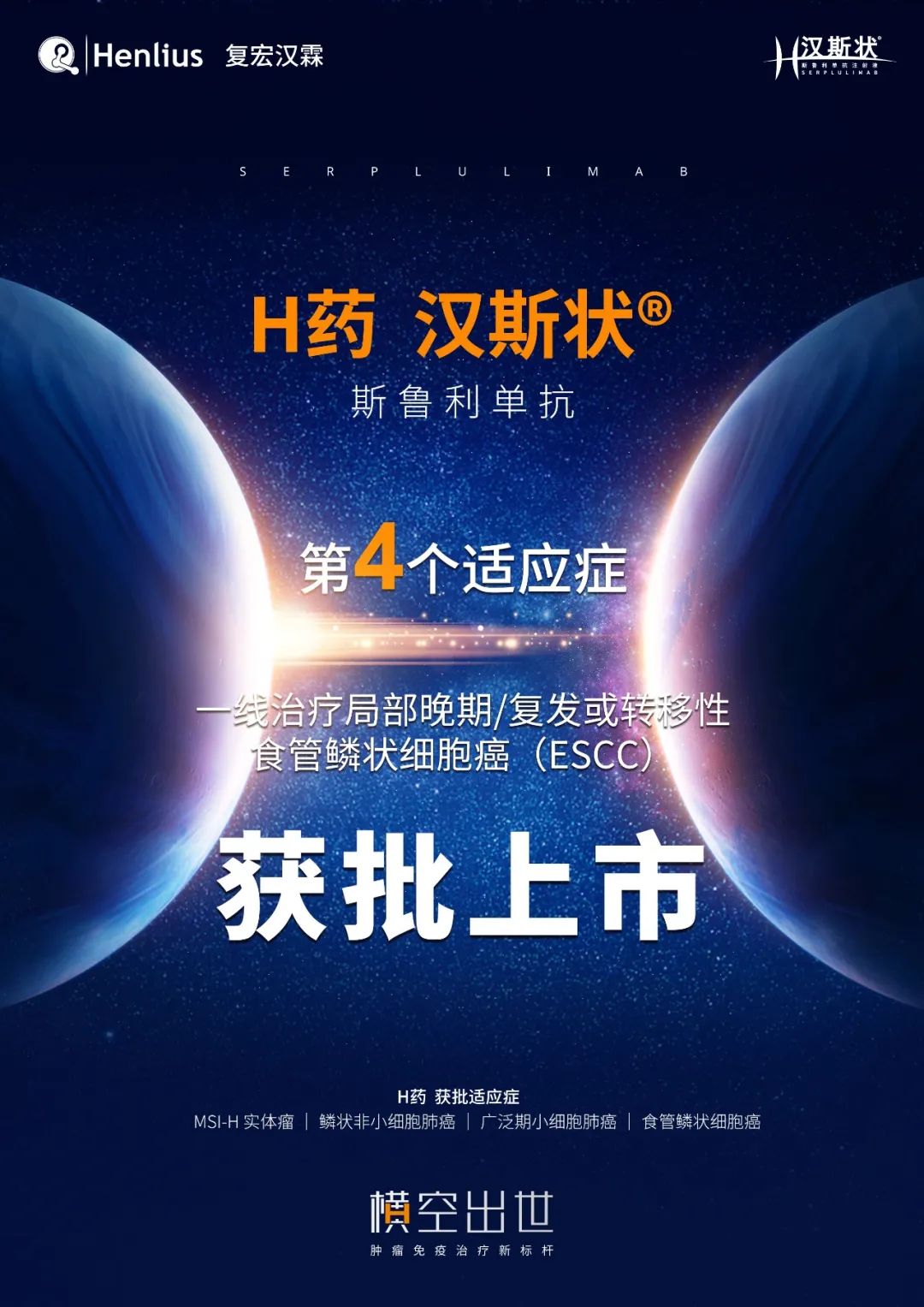 2023年9月22日,上海-复宏汉霖(2696.HK)宣布,公司自主研发的创新抗PD-1单抗H药——汉斯状®(通用名:斯鲁利单抗注射液)联合含氟尿嘧啶类和铂类药物用于PD-L1阳性的不可切除局部晚期/复发或转移性食管鳞状细胞癌(ESCC)的一线治疗新适应症的上市注册申请(NDA)获得国家药品监督管理局批准,为食管鳞癌患者提供了治疗新选择。此前,H药已获批治疗微卫星高度不稳定(MSI-H)实体瘤、鳞状非小细胞肺癌(sqNSCLC)和广泛期小细胞肺癌(ES-SCLC)三项适应症。复宏汉霖持续深化H药在肺癌、消化道肿瘤等领域的差异化、多维度布局,以期推动患者获得更高获益。