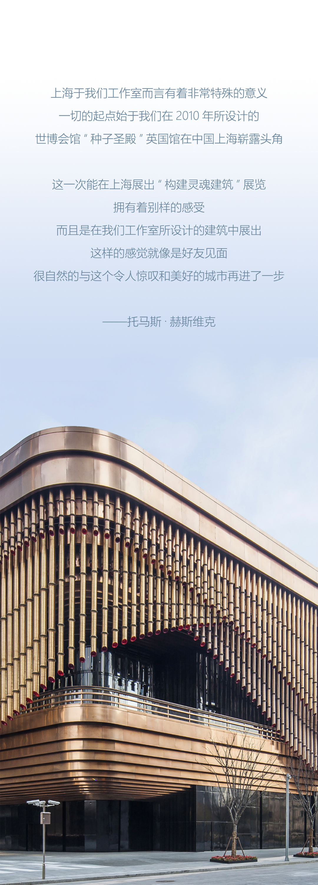 “构建灵魂建筑”将跨越工作室三十年的历史,通过从六个不同的视角回顾赫斯维克工作室于世界各地的经典项目,呈现包括位于新加坡南洋理工大学的学习中心、上海世博会上的英国馆、庆祝伊丽莎白女王登基70周年而特别设计的“百林之树”、位于上海的天安千树……