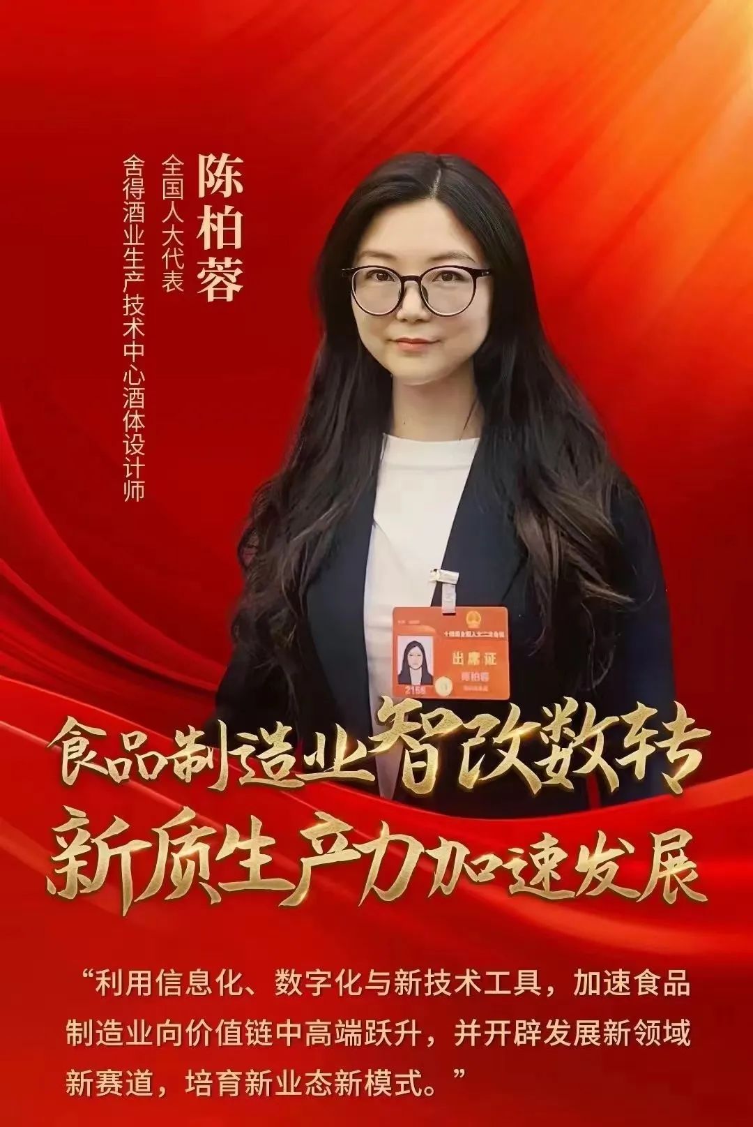 全国人大代表、舍得酒业生产技术中心酒体设计部酒体设计师陈柏蓉,是一名来自白酒科研一线的青年员工。今年全国两会,她围绕食品制造业“智改数转”主题提出具体建议。她建议在白酒行业先行先试,进而带动食品制造业整体转型升级。