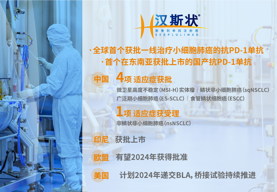 报告期内,复星医药自主研发的首款生物创新药汉斯状于中国境内新增获批广泛期小细胞肺癌(ES-SCLC)及食管鳞状细胞癌(ESCC)两项适应症,成为全球首个获批用于一线治疗广泛期小细胞肺癌(ES-SCLC)的靶向PD-1单抗药品。目前,汉斯状于中国境内已获批4项适应症,上市迄今已惠及6万余名中国患者。此外,斯鲁利单抗注射液亦已获印度尼西亚食品药品监督管理局(BPOM)批准用于治疗广泛期小细胞肺癌(ES-SCLC),系该产品首次于海外市场获批上市,也是首个在东南亚国家获批上市的国产PD-1单抗。