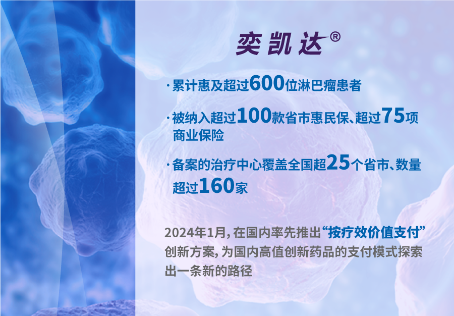合营公司复星凯特在国内上市的第一款 CAR-T细胞治疗产品奕凯达(阿基仑赛注射液)于2023年6月于中国境内新增获批二线适应症,惠及更多一线免疫化疗无效或复发患者。截至报告期末,奕凯达已累计惠及超过600位淋巴瘤患者,被纳入超过100款省市惠民保和超过75项商业保险,备案的治疗中心覆盖全国超25个省市、数量超过160家。2024年1月,奕凯达在国内率先推出按疗效价值支付的创新方案,为国内高值创新药品的支付模式探索出一条新的路径。