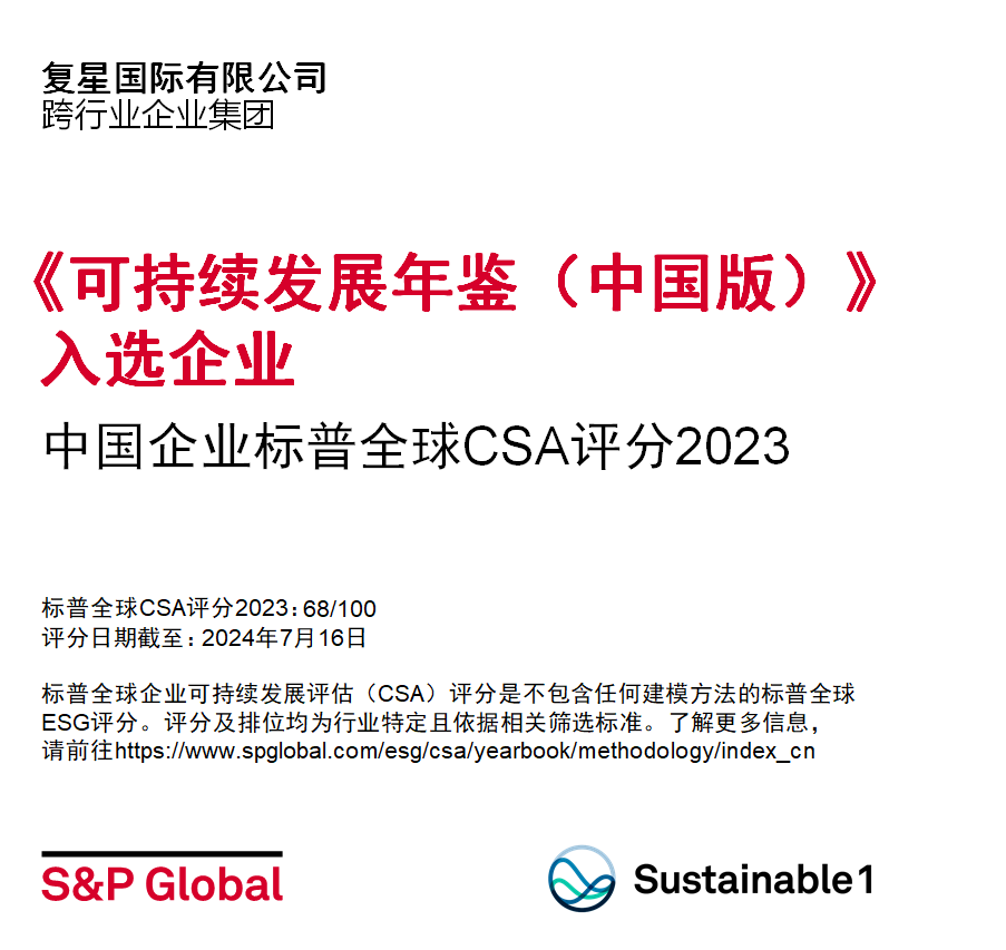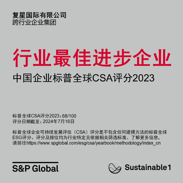 复星凭借多年来在ESG领域的持续深耕,长期的责任经营和履职成效,复星国际从2018年起,其标普全球CSA评分持续攀升并领先同业。复星国际的标普全球CSA评分,从2022年的56分跃升至2023年的68分,截止至2024年7月,总评分排名超过94%的全球同业,因此获标普全球授予“行业最佳进步企业”标徽。该标徽授予主动参与本年度和上年度CSA,在其所在行业标普全球CSA评分最高的15%以内,并在其行业中取得了最大的提升幅度,且升幅至少为5%的企业。