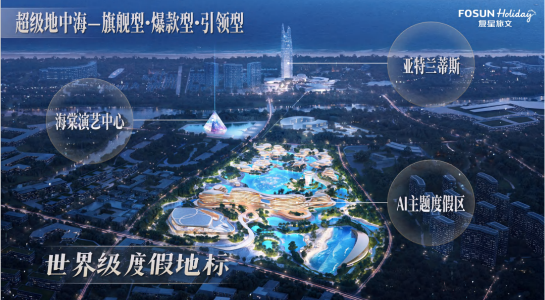 同时,全球独一无二的AI主题度假区是超级地中海的另一个亮点。复星相信,用AI的会淘汰不用AI的,AI用得好的会淘汰AI用得不好的。在AI主题度假区内,包含了诸多“首发概念”,包括全球首家AI智能度假酒店,AI数字人G.O服务,AIGC个性化客房,全球首条超现实主义未来水街,全球首个智能化冲浪池、AI娱雪等。我们相信,在各式创新融合的加持下,超级地中海必将成为海南和三亚新的世界级度假名片,引领未来度假的现象级作品。更多有关产品的信息,也敬请大家关注。