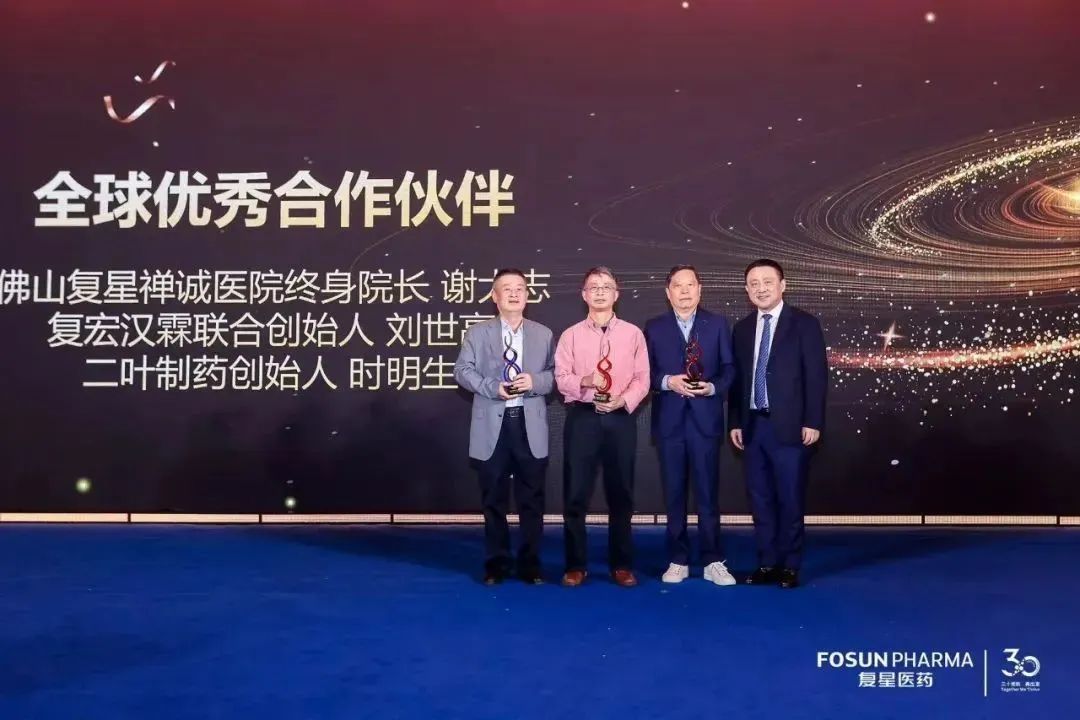 全球优秀合作伙伴(个人奖):佛山复星禅诚医院终身院长 谢大志、复宏汉霖联合创始人 刘世高、二叶制药创始人 时明生