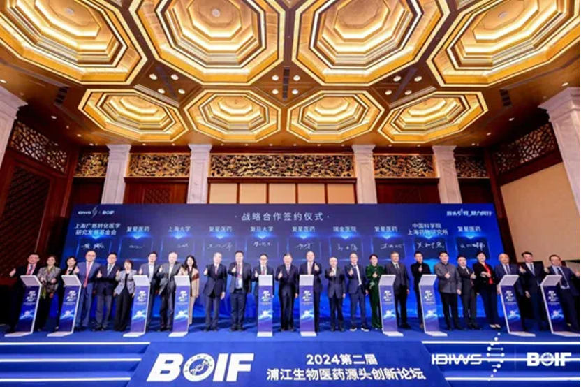 第二届浦江生物医药源头创新论坛现场,复星医药与上海广慈转化医学研究发展基金会、复旦大学、上海大学、瑞金医院、中科院药物研究所等机构签订战略合作协议