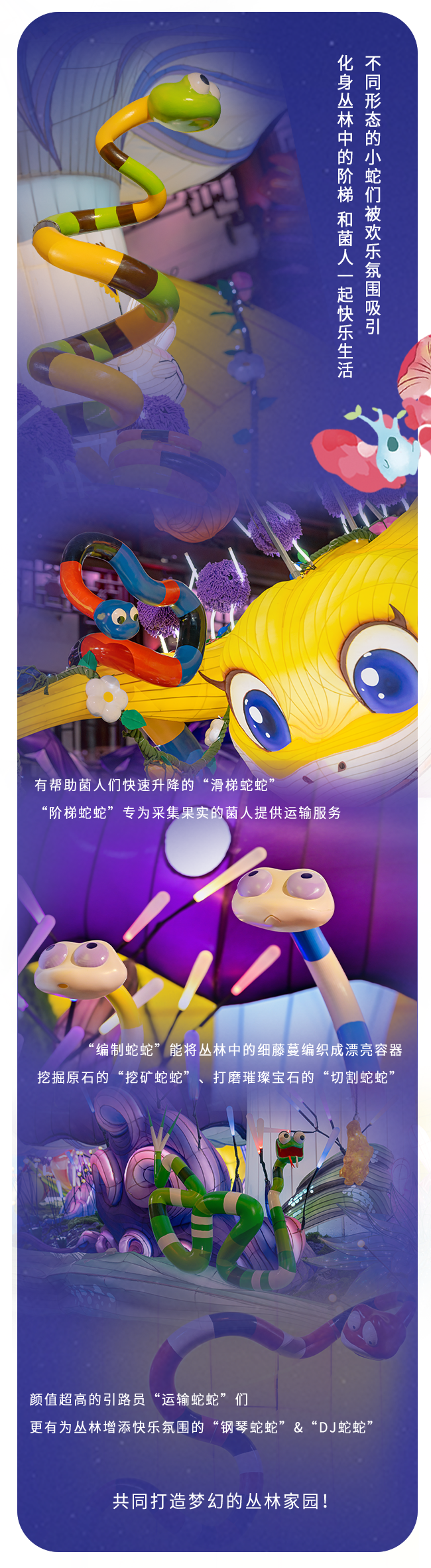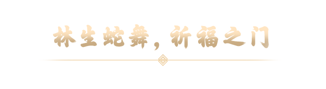 位于C位的耀眼金蛇,释放满满祥瑞!每晚伴随乐曲《金蛇狂舞》动态亮灯,以繁茂温暖的丛林之景为新年送福。