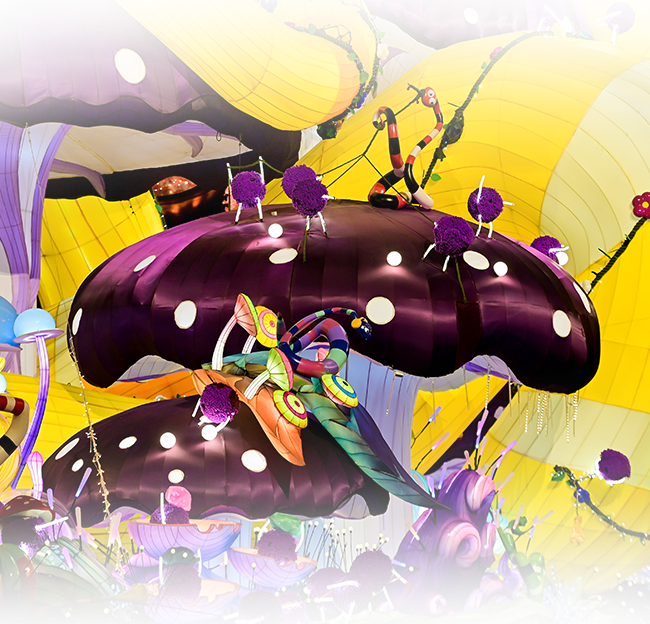 今年,中心广场上演不同以往的松弛感故事。从万物有灵大主题展开,围绕森林主题,打造小菌人、小蛇、灵蛇共生的原始蘑菇丛林。金色灵蛇盘绕在蘑菇丛林中,与可爱菌人一同奏响一场丛林交响曲,传递新年节日的祝福,以趣味的创意表达带来活力气息。
