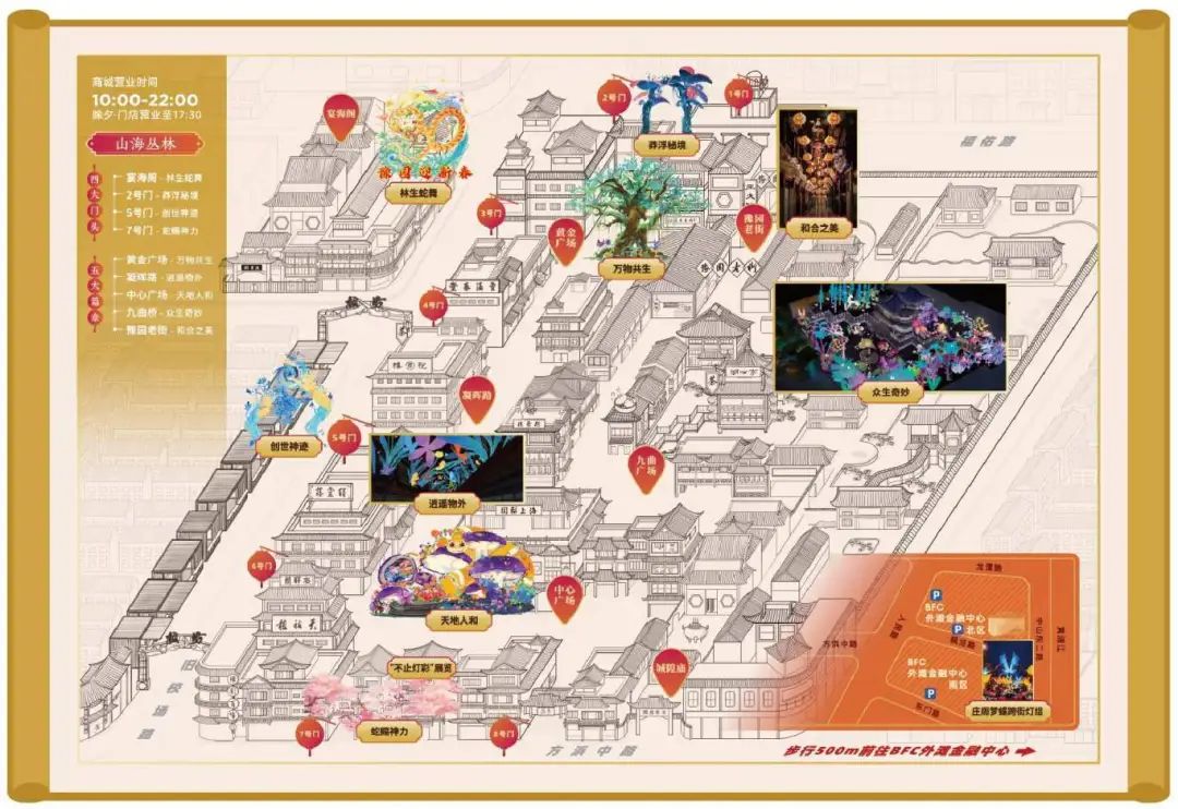游人可在豫园灯会赏丛林奇境后,从豫园商城8号门或1号门出,步行经方浜中路或福佑路至BFC外滩金融中心,打卡枫泾路上的同款“庄周梦蝶”灯组。
