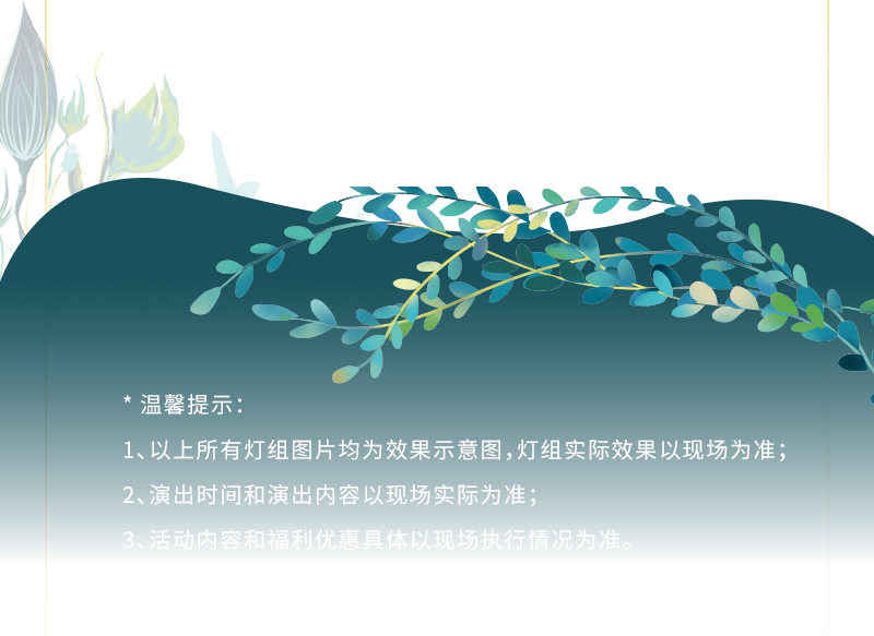 灯会期间,每晚在中心广场上演亮灯仪式。花仙子降临奇妙丛林,中心花朵缓缓绽放,灯组随音乐变幻渐次点亮,光华璀璨!