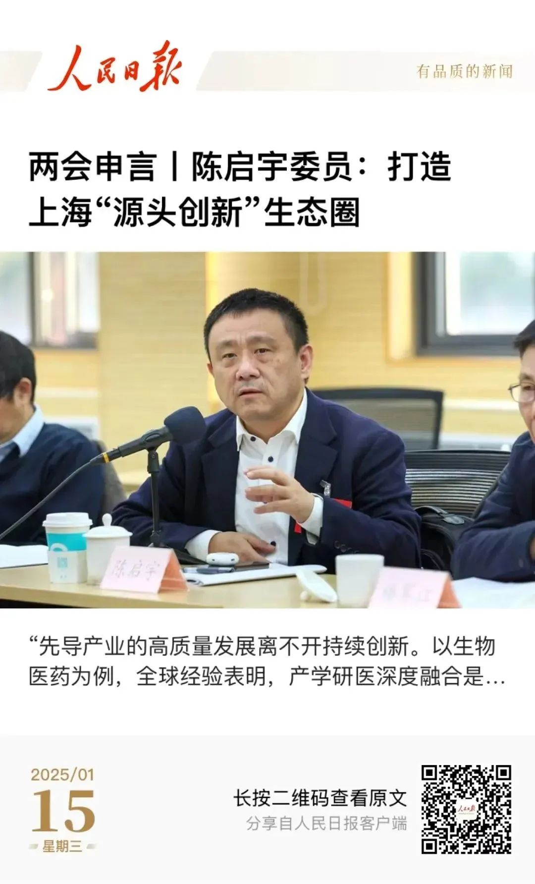 陈启宇:鼓励创新策源,助推上海生物医药产业高质量发展
