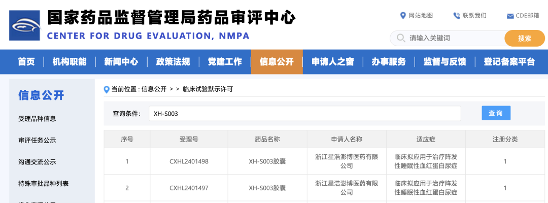 2025年3月13日,复星医药宣布控股子公司浙江星浩澎博医药有限公司(以下简称“星浩澎博”)于近日收到国家药品监督管理局关于同意XH-S003胶囊(申请注册分类:化药1类;以下简称“XH-S003”)用于治疗阵发性睡眠性血红蛋白尿症(PNH)开展临床试验的批准。星浩澎博拟于条件具备后于中国境内(不包括港澳台地区,下同)开展II期临床试验。