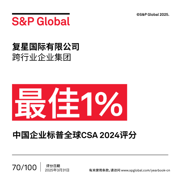 在全球参评行业中,截至2025年4月,复星国际排名位列全球同业前5%,并成功入选标普全球《可持续发展年鉴2025》。