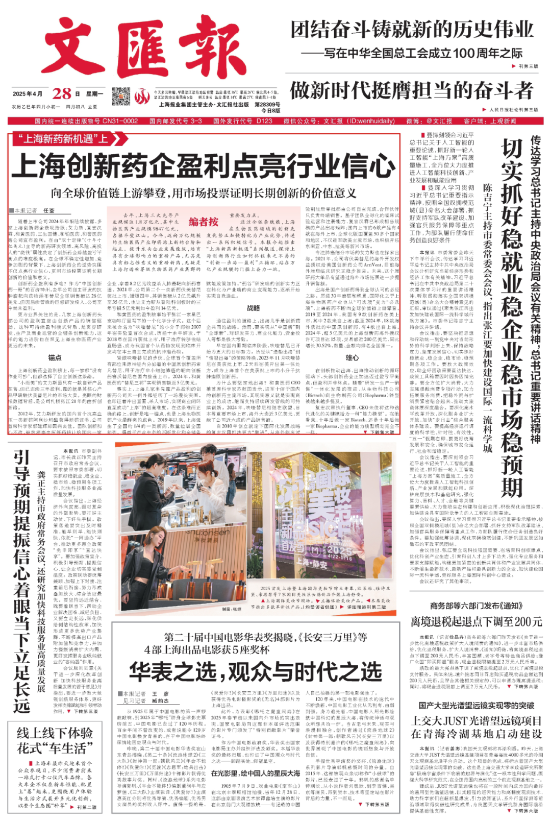 上海在生物医药领域的创新先发优势正加快转化为产业优势,传递出一系列积极信号。4月28日出版的文汇报头版头条刊发文章《上海创新药企盈利点亮行业信心》,关注复星生物创新药平台——复宏汉霖等上海创新药企,用市场投票证明长期创新的价值和意义。
