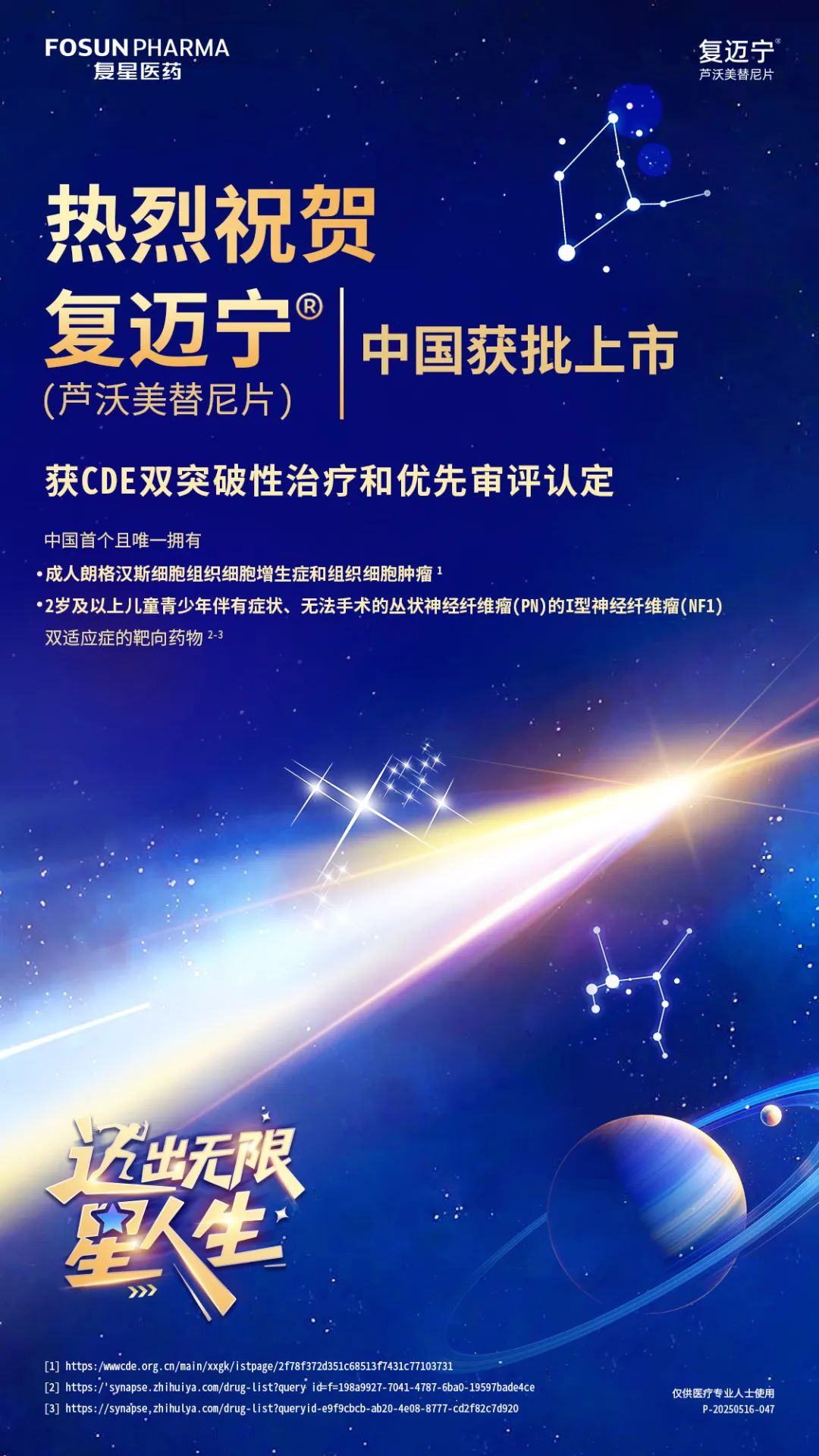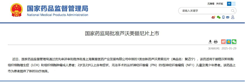 5月29日,复星医药宣布,自主研发的1类新药芦沃美替尼片(商品名:复迈宁®;项目代号:FCN-159)正式获得国家药品监督管理局(NMPA)批准上市。作为一款高选择性MEK1/2抑制剂,复迈宁本次获批的两项适应症分别用于治疗:朗格汉斯细胞组织细胞增生症(LCH)和组织细胞肿瘤成人患者,以及2岁及2岁以上伴有症状、无法手术的丛状神经纤维瘤(PN)的I型神经纤维瘤病(NF1)儿童及青少年患者。复迈宁的双适应症获批填补了相关罕见肿瘤领域的治疗需求,为患者提供了新的治疗选择。