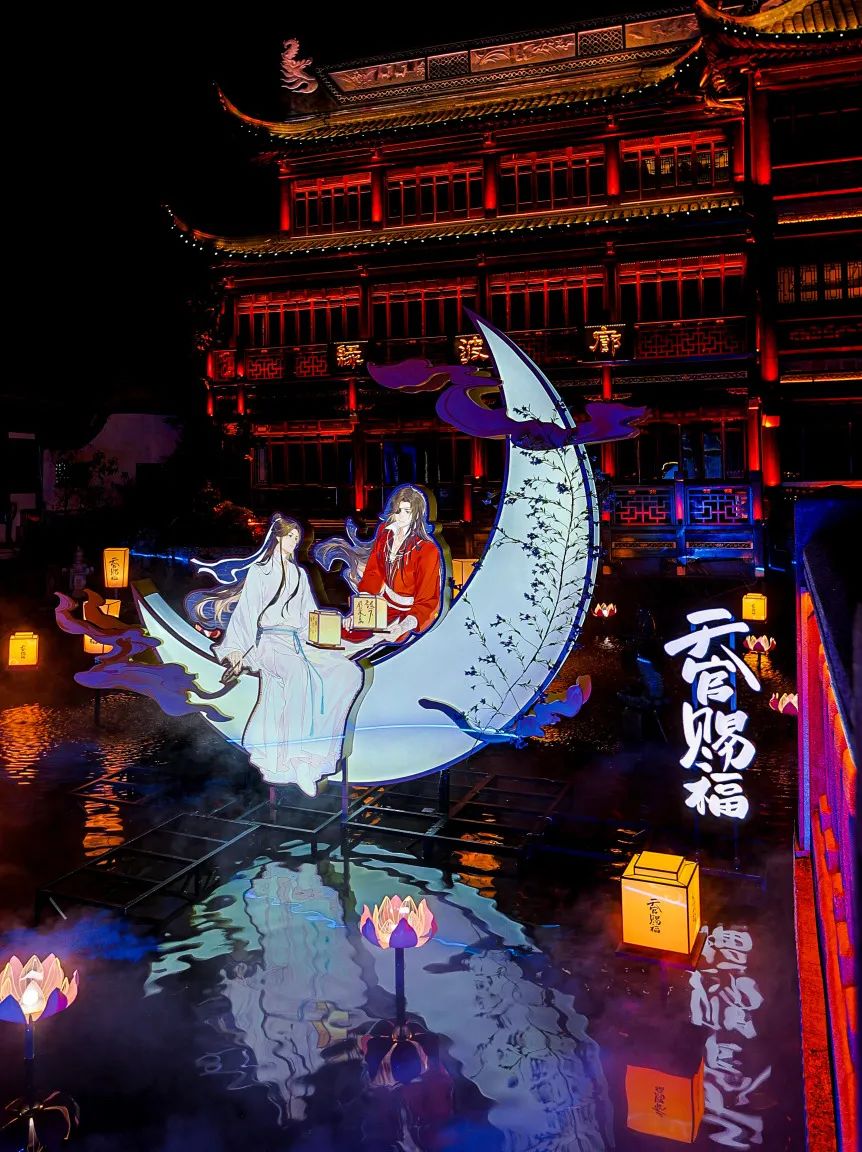 踏入豫园商城2号门,宛如启动次元穿梭的开关。被誉为“中式浪漫天花板”的凝晖路,被精心还原为动画《天官赐福》中的极乐坊。豫园老街与《时光代理人》以“时光穿梭”为纽带,将动画叙事与现实空间紧密缝合。九曲桥畔,《百妖谱》的百夭桃树、《牧神记》的大墟秘境、《雾山五行》的泼墨山水与《天官赐福》的明灯三千在激光雾森中流转成灵动画卷,缔造出令人屏息的东方幻想世界。