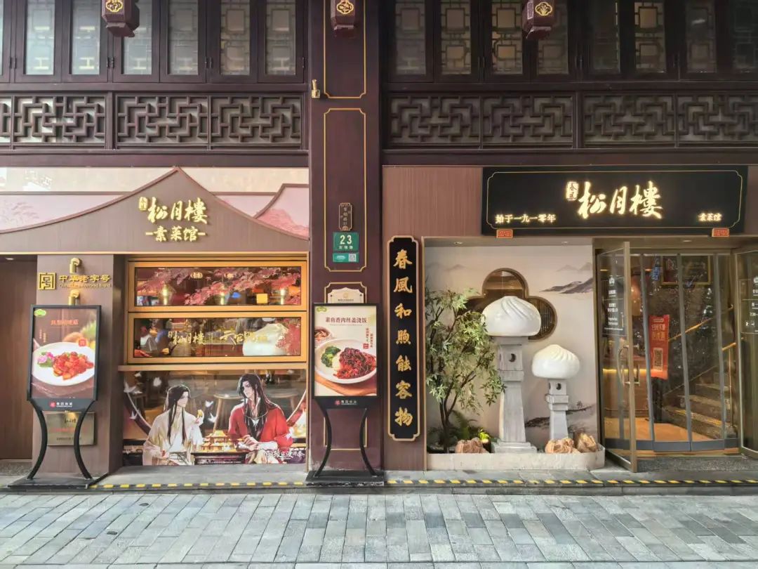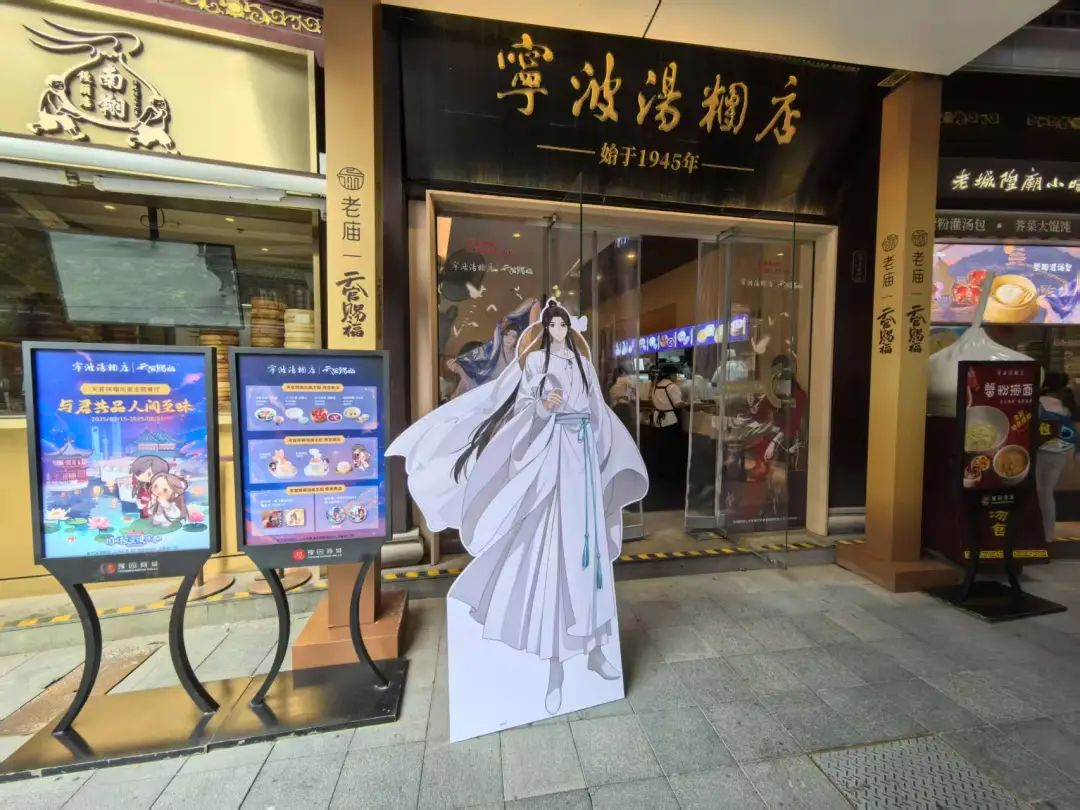 这场盛事不仅是视觉盛宴,更是可触可感的有温度的沉浸消费体验。豫园商城全域联动国创IP,打造“可食用、可穿戴、可收藏”的国创宇宙:《天官赐福》动画全新动画短片线下首发;多个IP周边限定亮相;湖心亭与《有兽焉》跨次元联名,“皮皮”也会惊喜现身。老字号品牌亦积极拥抱次元,老庙黄金推出《天官赐福》联名金饰;宁波汤团店、上海老饭店分别打造《天官赐福》《时光代理人》主题餐厅;松鹤楼、春风松月楼推出IP主题套餐;涵春茶肆则与《凡人》动画深度合作。
