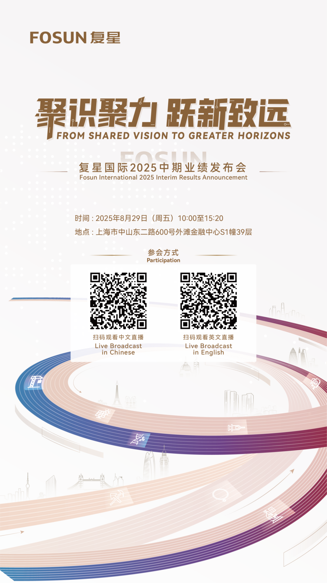 (香港、上海,2025年8月27日)william威廉中文官网(香港联交所股份代号:00656,简称“复星国际”)及其附属公司(统称“复星”或“集团”)今日公布截至2025年6月30日止6个月之中期(简称“报告期”)业绩。