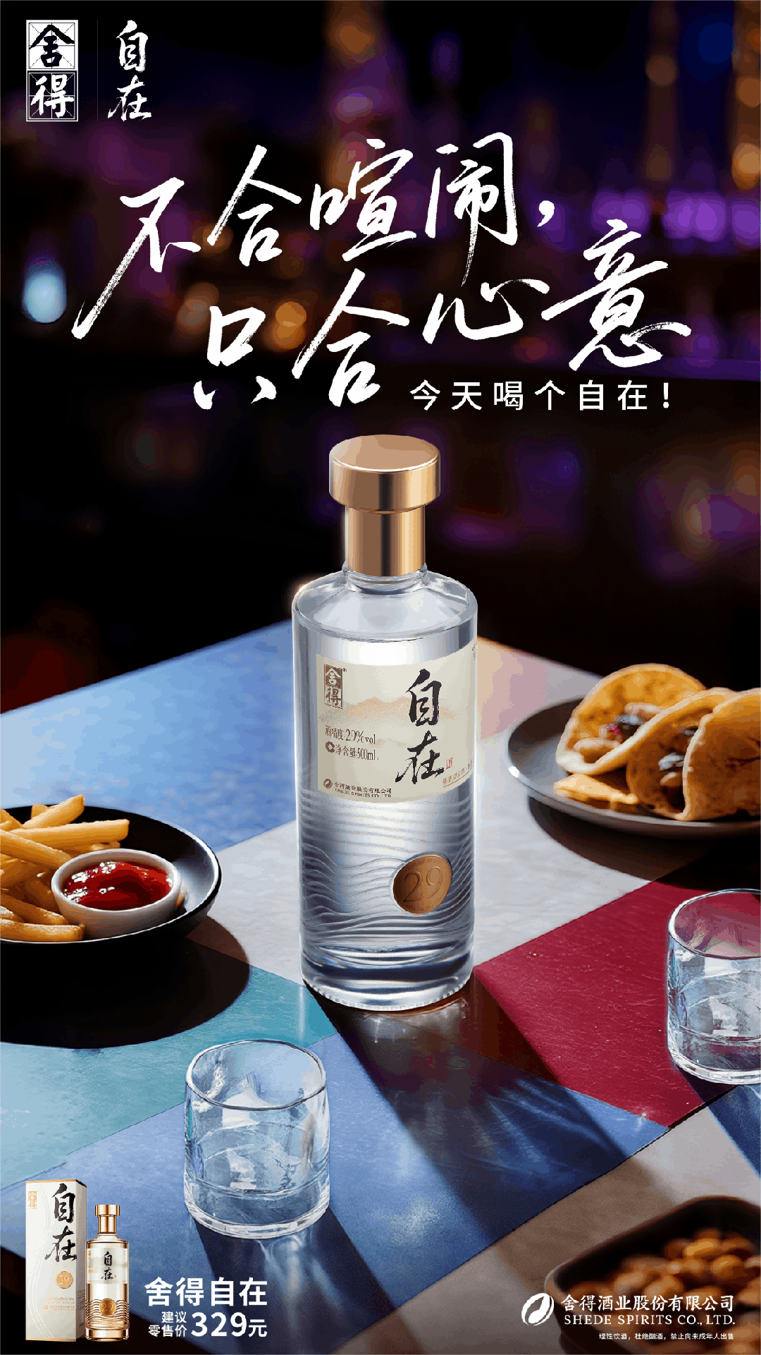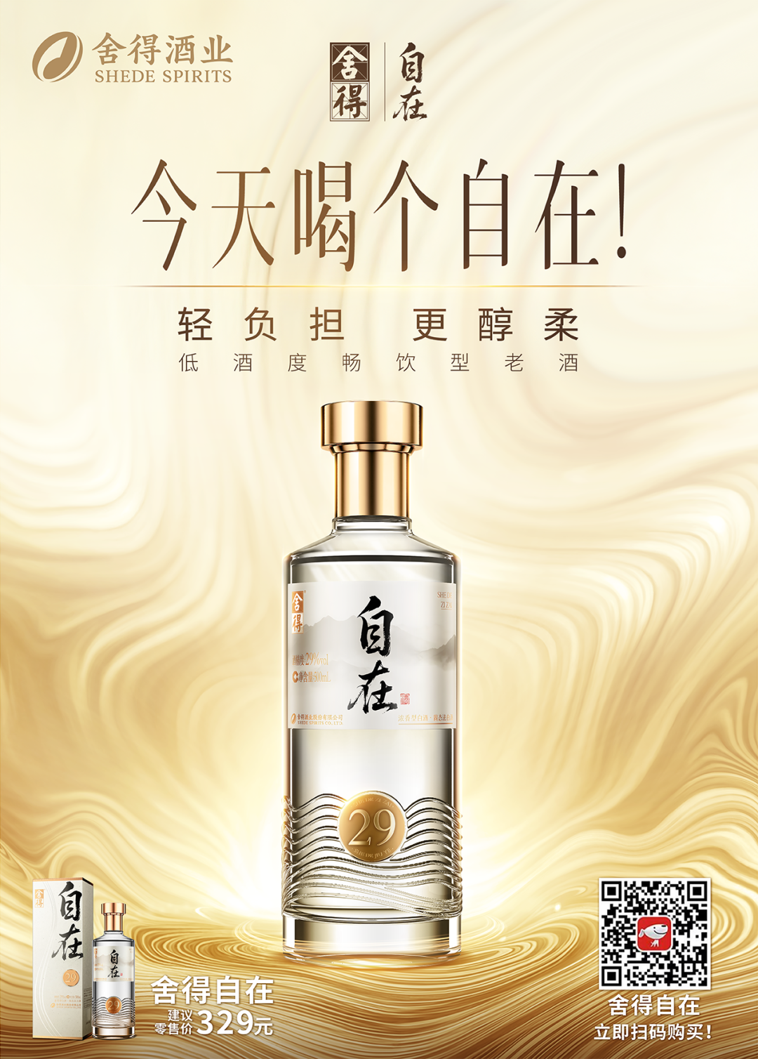 其四,高颜值设计。瓶身设计摒弃繁复,“舍得自在”采取通透瓶体颜值依旧能打,新中式东方韵味与极简现代风格兼具,给人“低度轻盈”感官认知;醒目的29度金色标识传达“低酒度无压力”产品特性,降低消费者对饮用白酒的心理门槛。