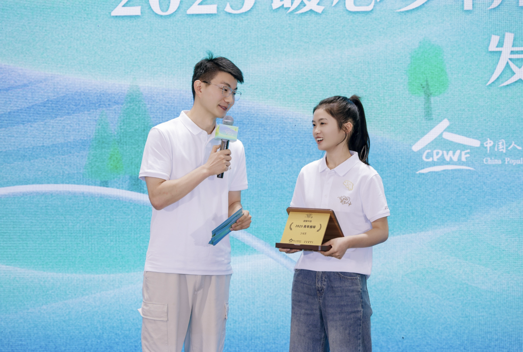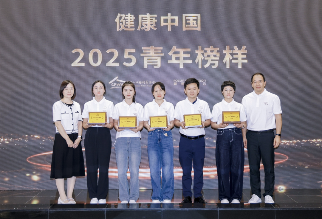 国家卫生健康委卫生发展研究中心基层卫生研究室副主任、研究员张丽芳(左一)、复星联席首席战略赋能官施喆(右一)为“2025青年榜样”颁发荣誉
