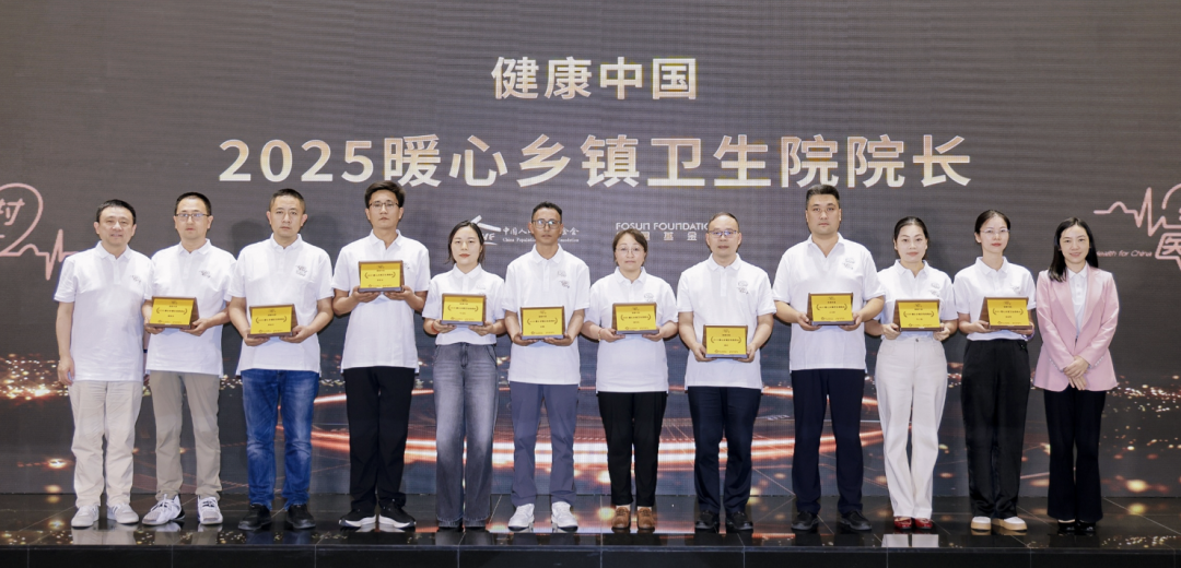 复星国际联席首席执行官陈启宇(左一)、阿里巴巴公益基金会秘书长姚瑶(右一)为“2025暖心乡镇卫生院院长”颁发荣誉