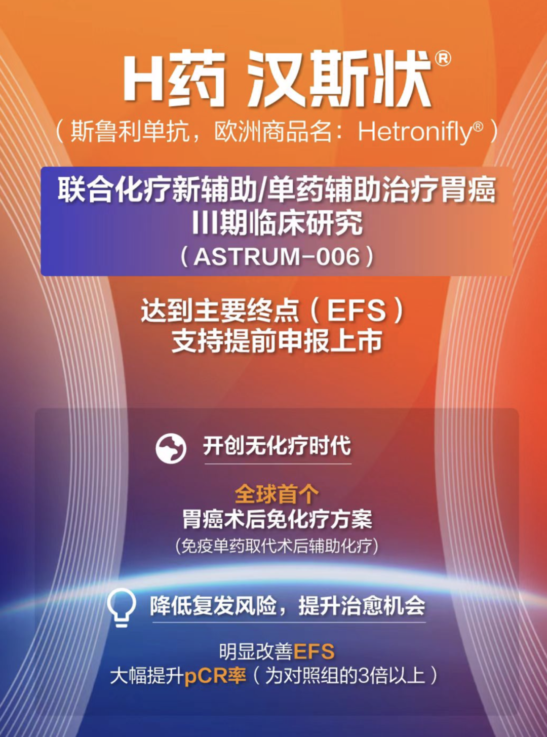 复星医药自主研发的创新型PD-1抑制剂汉斯状®(斯鲁利单抗注射液)各项临床顺利推进,其中,汉斯状®联合化疗用于胃癌新辅助/辅助治疗的III期临床研究已达到主要研究终点,可支持提前申报上市。汉斯状®成为全球首个胃癌围术期(术前/术后)以免疫单药取代术后辅助化疗的治疗方案,实现了该领域的重大突破。截至10月,斯鲁利单抗注射液联合化疗一线治疗广泛期小细胞肺癌(ES-SCLC)的美国桥接试验已完成全部200例患者入组,将为后续向美国食品药品监督管理局(FDA)递交生物制品许可申请(BLA)奠定坚实基础。作为全球首个获批用于一线治疗ES-SCLC的抗PD-1单抗,斯鲁利单抗注射液已在中国、英国、德国、新加坡、印度等近40个国家和地区获批上市,彰显中国创新药出海“高质量样本”。