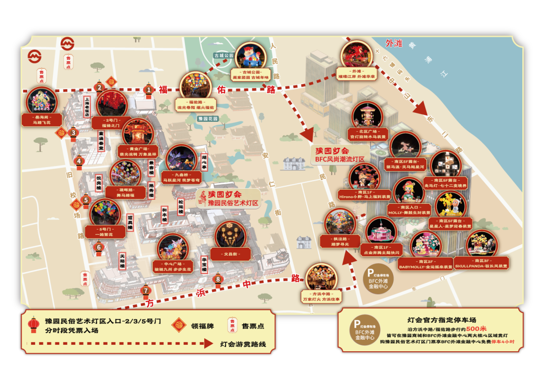 1月26日,豫园民俗艺术灯区率先点亮,邀你从这一站出发,走进上海年味之旅!今年门票与往年大不相同,它不止是豫园民俗艺术灯区的门票,更可一票通玩六大灯区!首次开放更多免费赏灯区域,在BFC风尚潮流灯区,泡泡玛特联合BFC打造新春游园会,星星人等IP灯组火爆登场。