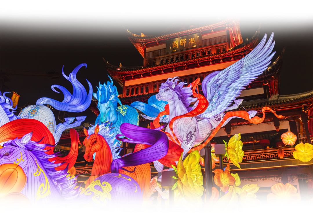 在外滩灯区,来自《山海经》的神骏“驳”昂然而立,身姿矫健、步履如飞的七匹骏马沿街列阵。在十六铺码头的城市地标旁,豫园马年灯会的标识牌静静亮起。更有十座骏马灯组沿滨江栈道渐次展开,每匹马姿态舒展、形神各异。历史文脉、江涛声韵与璀璨灯火在此交织成曲,沿江徐行,一路追随光影序列,步入大豫园灯会的璀璨胜境。