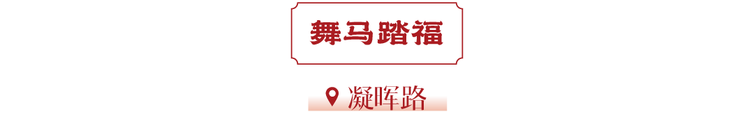 第一段是历史人文段,六匹溯源自中国各个朝代的舞马,分别是新石器时代的彩陶灵马、夏商周时期的青铜战马、春秋战国时期的错金云马、唐代时期的三彩纯马、宋代时期的青川天马、元代时期的青花吉马,点亮了凝晖路。青川天马自《千里江山图》壮丽山河与盛唐舞马祥瑞中幻化而来,身披青绿山水纹,体态优雅灵动,遨游于天地之间,象征心情的旷野自在。在奔跑的骏马间还藏着一些从传统年节文化中提取的可爱元素——“钱币”“礼花”“喇叭”“烟花”“福袋”等,传统又不失时尚趣味。