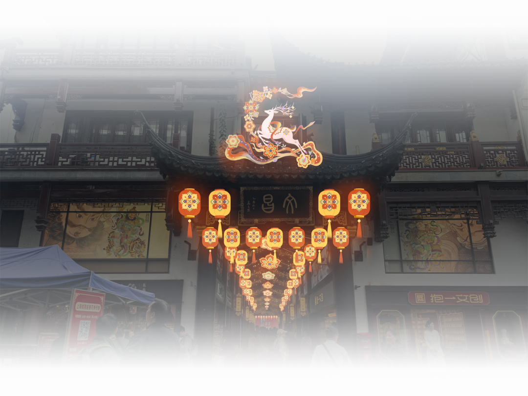 敦煌是多元文明交汇的“活化石”,上海是“海纳百川”文化交融的典范,当敦煌九色鹿与宝相花纹带着吉祥如意来到豫园,文昌街将两座城市的特色相融合,演绎两地文化的交融和碰撞。