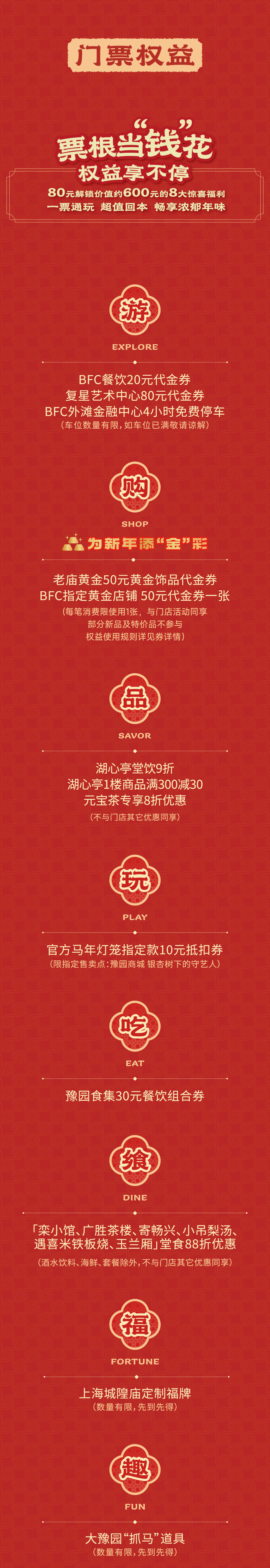畅享价值约600元八大超值权益,票根可当“钱”花!价值60元的BFC外滩金融中心4小时免费停车让你赏灯停车不再难,累计100元超值买黄金券让你春节买黄金薅羊毛最划算,城隍庙定制福牌福气送到手,吃喝玩乐吃饭享尽30余家优惠,赏灯停车吃饭购物接福回家!更有豫园BFC双区加磅36天演出不间断,豫园和BFC年味市集、特色商户推出限定文创、年货好礼、联名产品多选择,更有提供电子赏灯导航服务、赛博科技体验等,一票让你体验“豫园·BFC·外滩”最地道最浓郁上海年味路线。