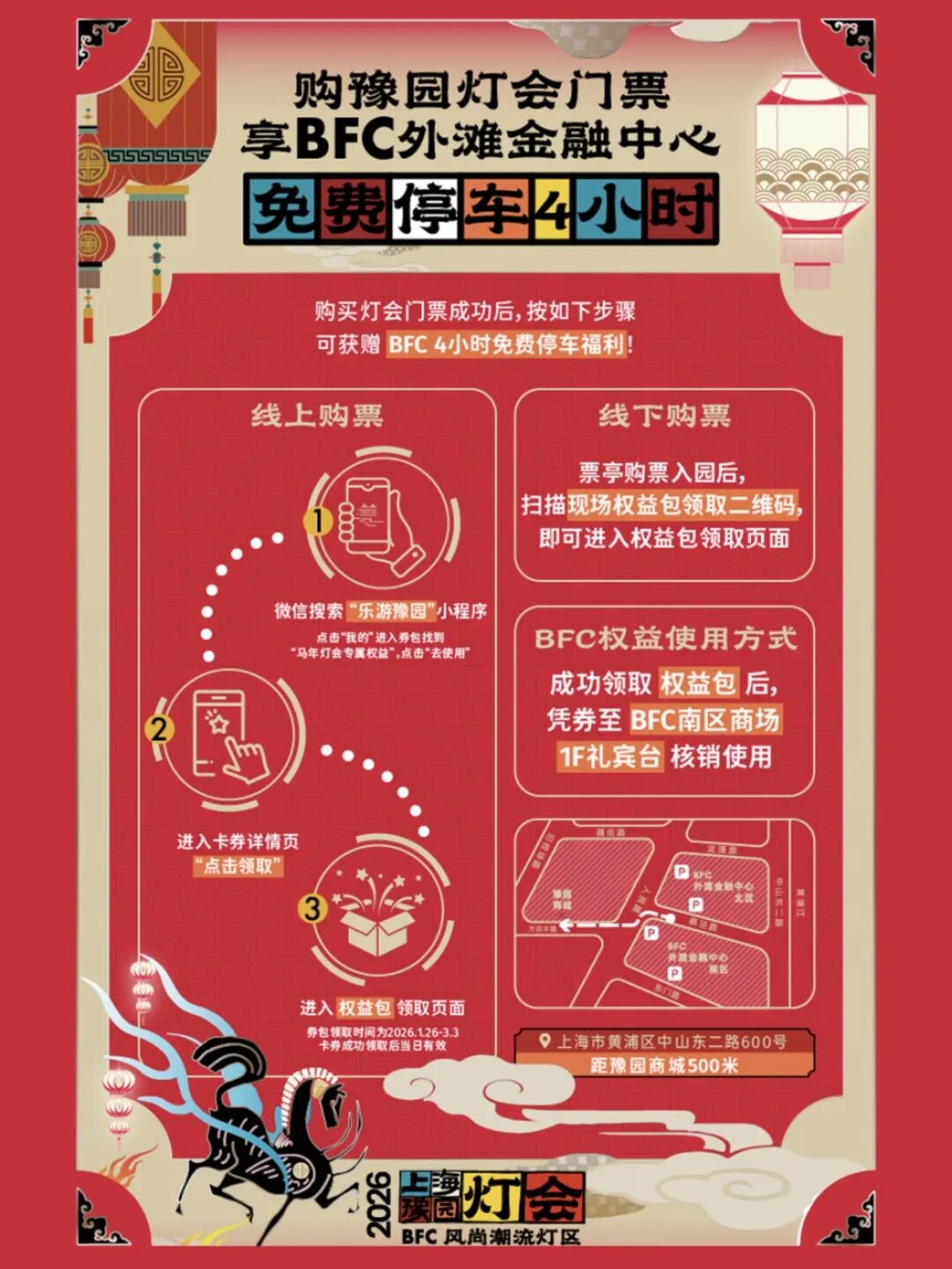 为方便游客畅游大豫园片区,BFC特别推出凭豫园灯会门票享4小时免费停车的贴心服务,深受自驾家庭客群欢迎,让大家在赏灯逛街之余更加从容尽兴。伴随旺盛的客流,多家潮流餐饮、文创零售及快闪店门前频频排起长队,BFC已然成为这个春节年轻人社交打卡的潮流地标。