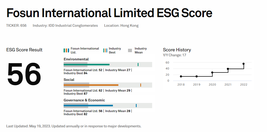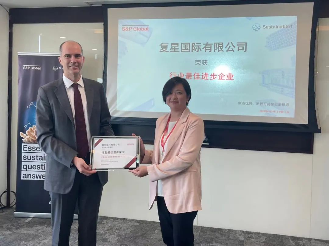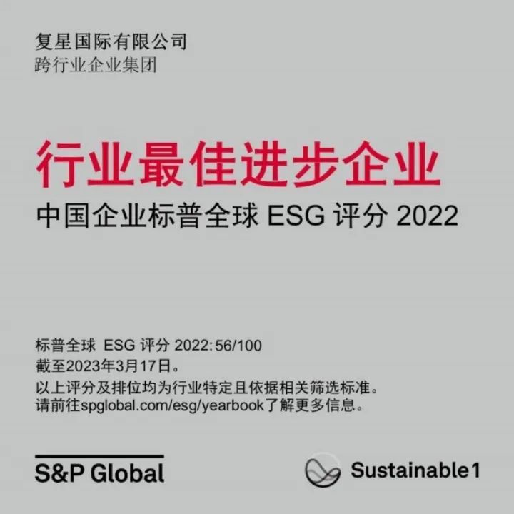 复星一直关注全球可持续发展领域的发展,已建立完善的ESG管理体系,多年来将ESG管理要求融入经营管理中,并积极响应国家战略、保障信息安全、促进科技创新、落实“双碳”目标、参与公益慈善、保障员工权益,助力可持续管理与价值创造。复星凭借多年来在ESG领域的持续深耕,长期的责任经营和履职成效,复星国际从2018年起,其标普全球CSA ESG评分持续攀升并领先同业,因此获标普全球授予“行业最佳进步企业”标徽。