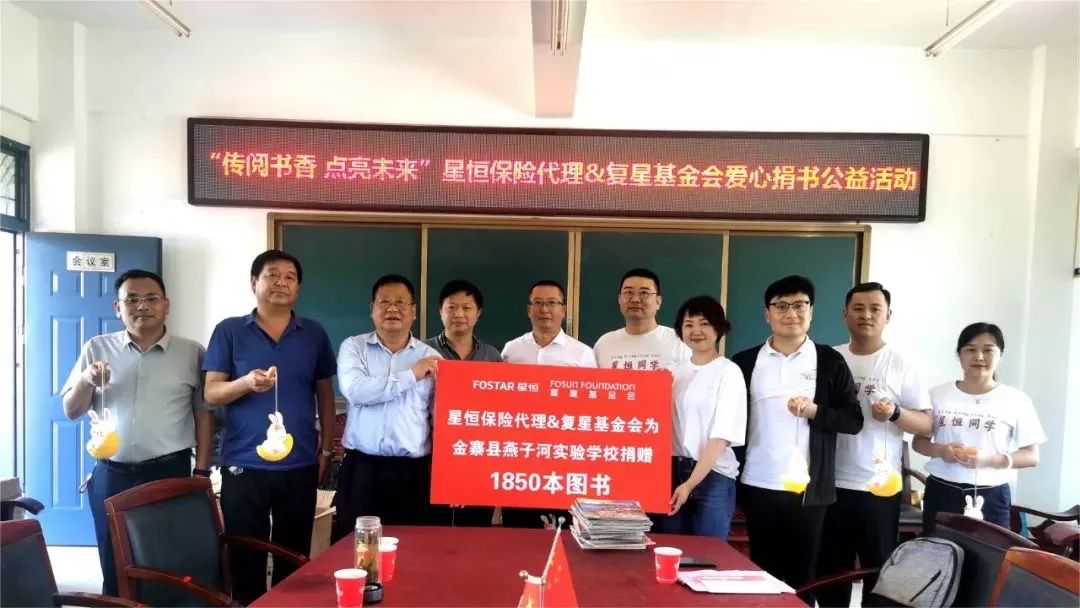 为助力老区留守儿童教育关爱工作,呵护孩子们在书香中健康成长,星恒保险代理有限责任公司号召企业员工参与回收1850本闲置书籍,并于6月6日携手复星基金会来到乡村医生项目县——安徽省金寨县,向燕子河实验学校送出回收到的闲置书籍,让书籍和知识循环起来。