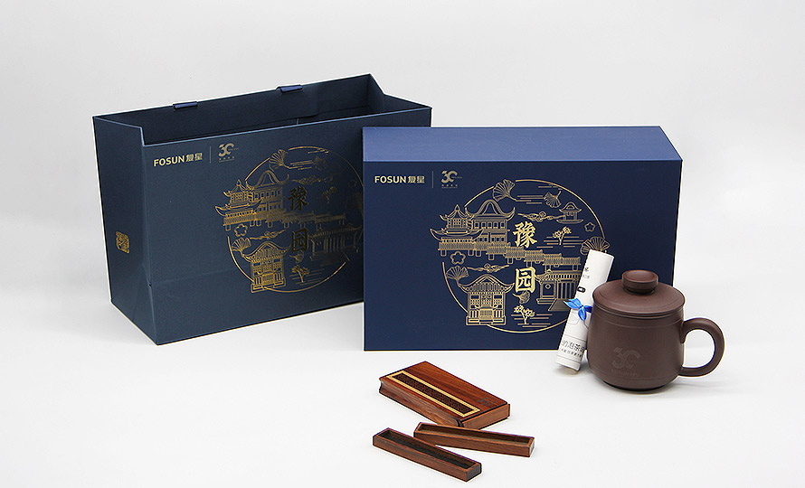 恰逢复星30周年之际,豫园文创将传统豫园的国风印象聚集于香器、茶器中,焚香、品茗,忆往昔奋斗岁月,盼未来自在前程。产品组成为:紫砂办公杯一套(杯盖、茶漏、杯身)、老挝大红酸枝便携式木香盒一件、龙涎香线香六支。