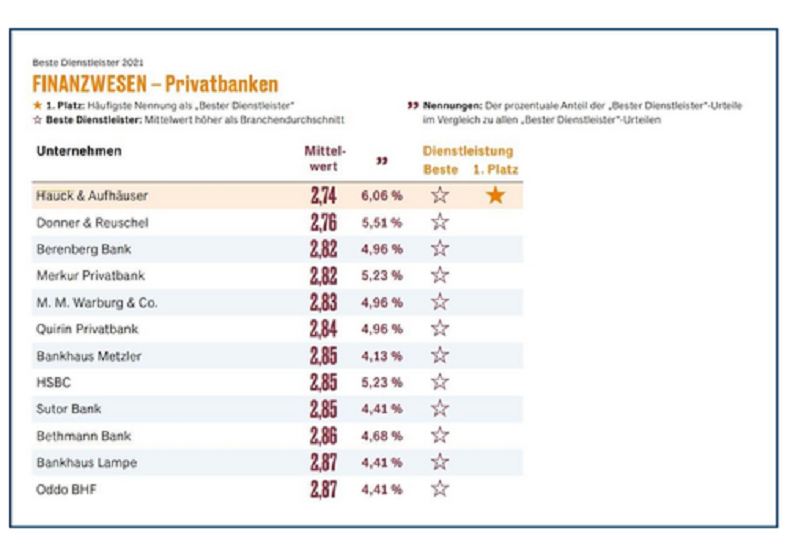 Hauck & Aufhäuser wird zum dritten Mal als beste Privatbank vom Handelsblatt ausgezeichnet