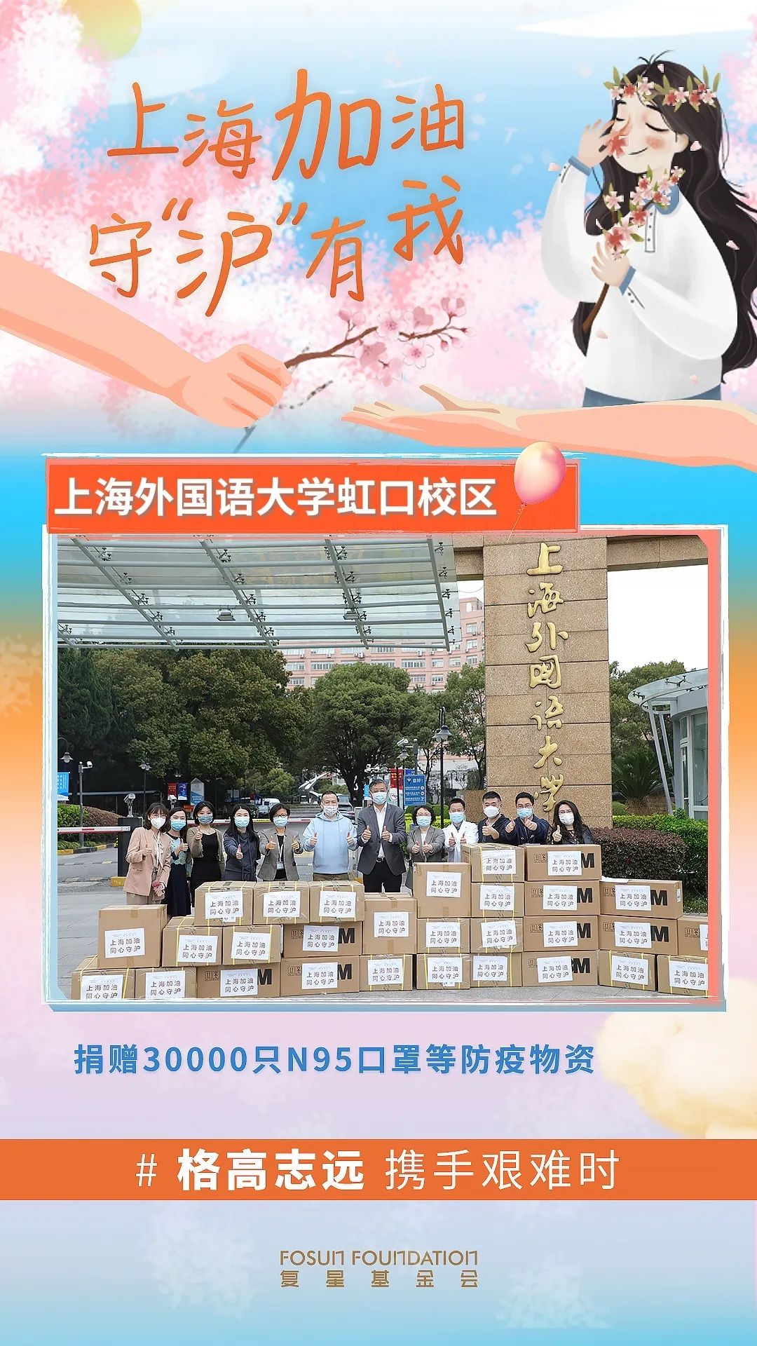 目前,上海全市所有高校都按照校区采用了封闭管理模式,落实全员排查,校内对防疫物资等需求激增。15日晚七点左右,复星基金会接到上外党委书记姜锋的电话,了解到学校亟需增援一批抗疫及生活物资。复星春季抗疫指挥部迅速响应协调资源,除了安排发往虹口校区的口罩,另有包括消杀用品、燕麦饮等1万余件物资送往松江校区。