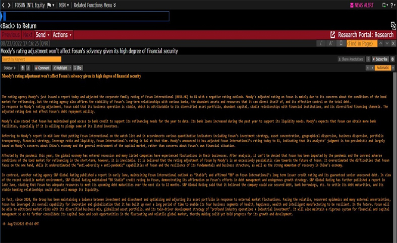 (23 août 2022) Un analyste qui est un leader d'opinion clé (KOL) a fait une analyse sur le terminal de Bloomberg à propos de Fosun International après la publication du rapport de notation de Moody's sur ce dernier. Le texte suivant est un extrait de l'article publié sur le terminal de Bloomberg :Le 23 août, l'agence de notation Moody's a publié un rapport ajustant l