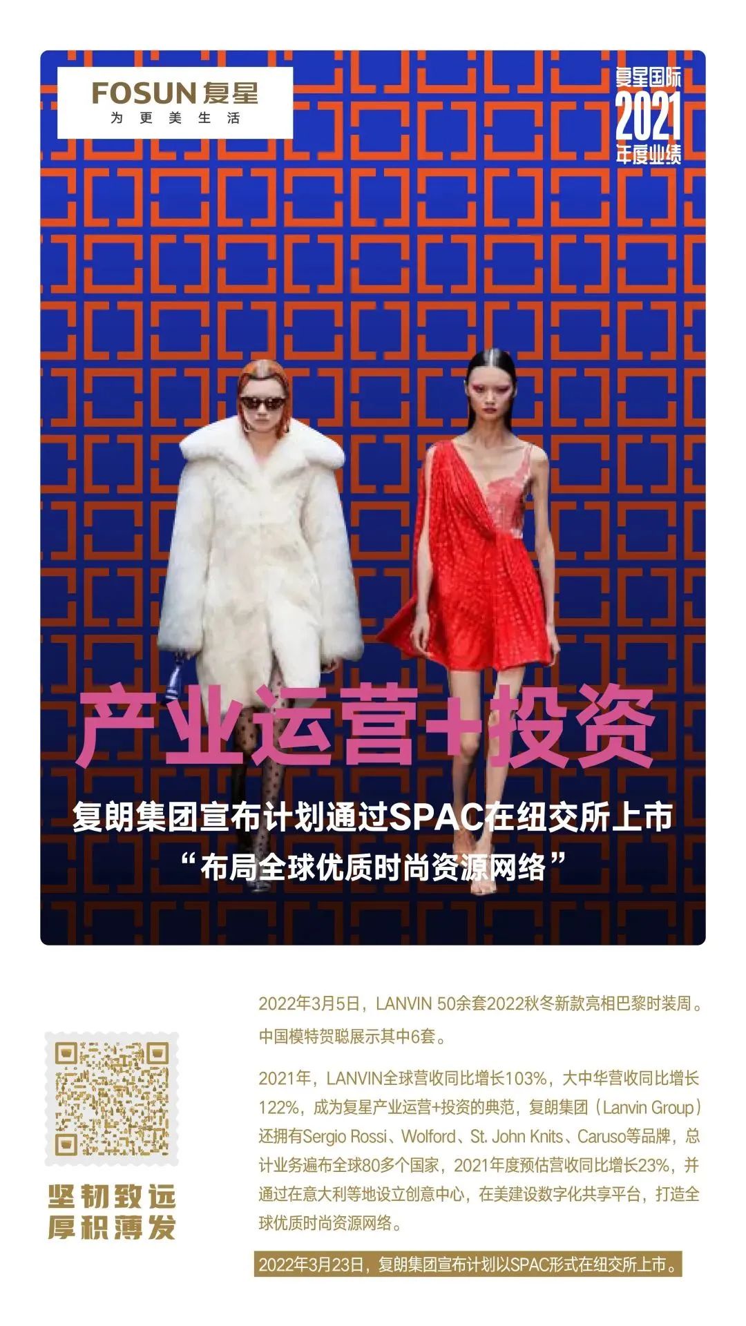 3月23日,全球时尚奢侈品集团Lanvin Group(复朗集团)(“复朗集团”)与Primavera Capital Acquisition Corp.(纽交所代码:PV,简称“PCAC”)宣布,双方已达成最终合并协议,交易后复朗集团将在纽约证券交易所上市,股票代码为“LANV”。PCAC是一家在纽约证券交易所上市的特殊目的收购公司,也是春华资本集团(简称“春华“)旗下的附属公司。春华是一家全球领先的投资管理公司,管理资产超过170亿美元。