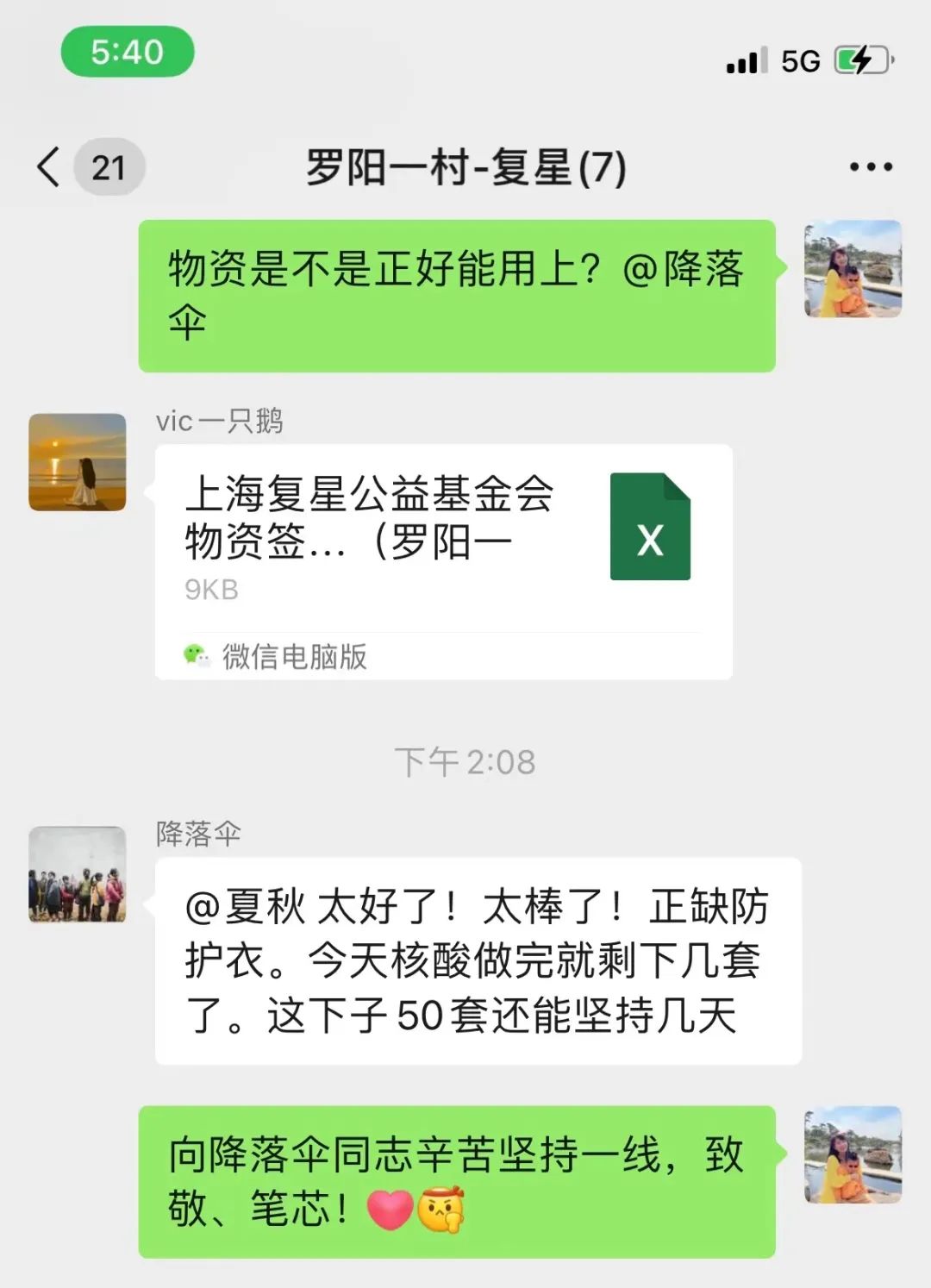 昵称“降落伞”的志愿者在群里@复星基金会员工刘夏秋。4月4日送达闵行区罗阳一村的防疫物资顺利衔接上前面一批。